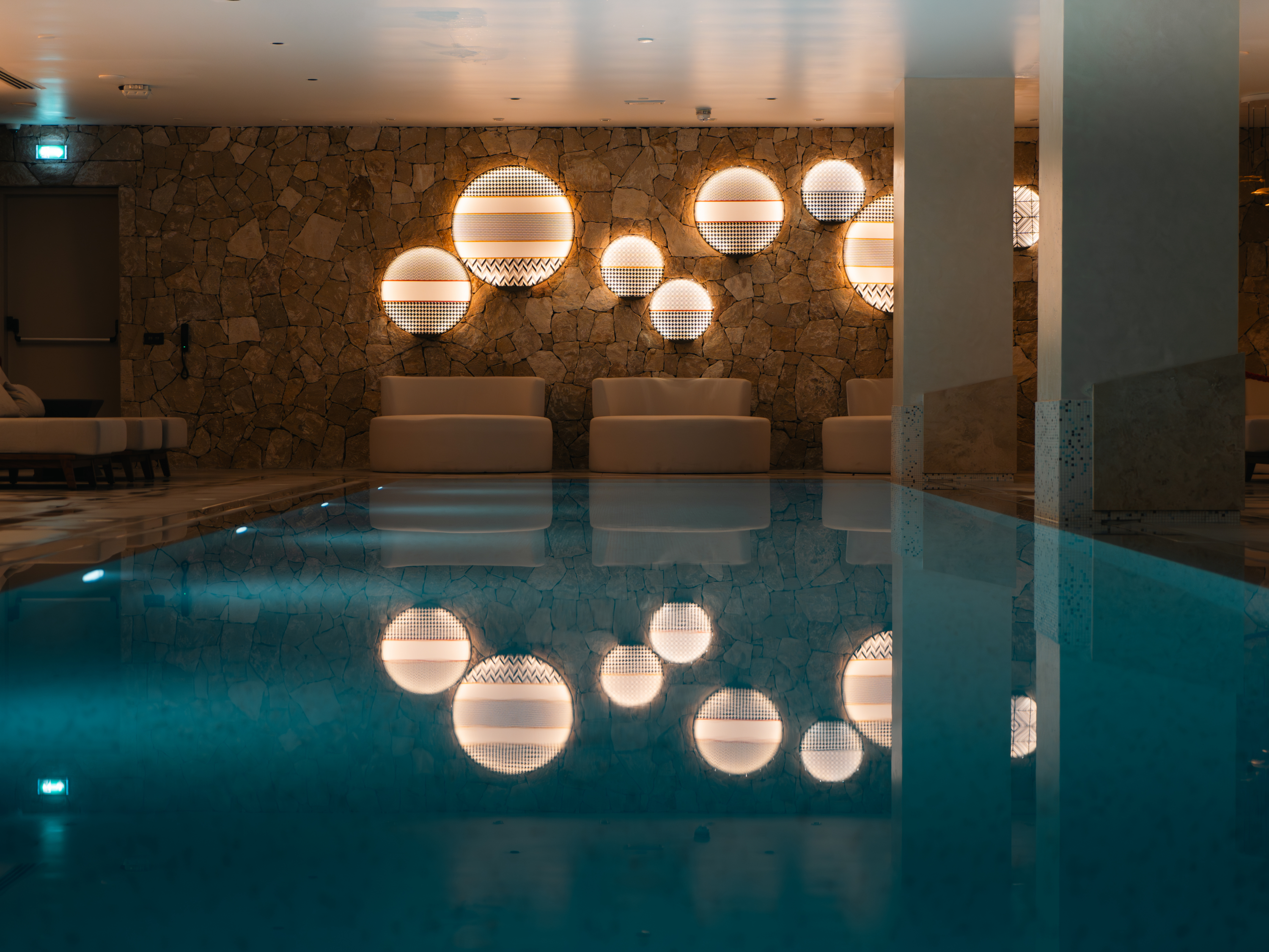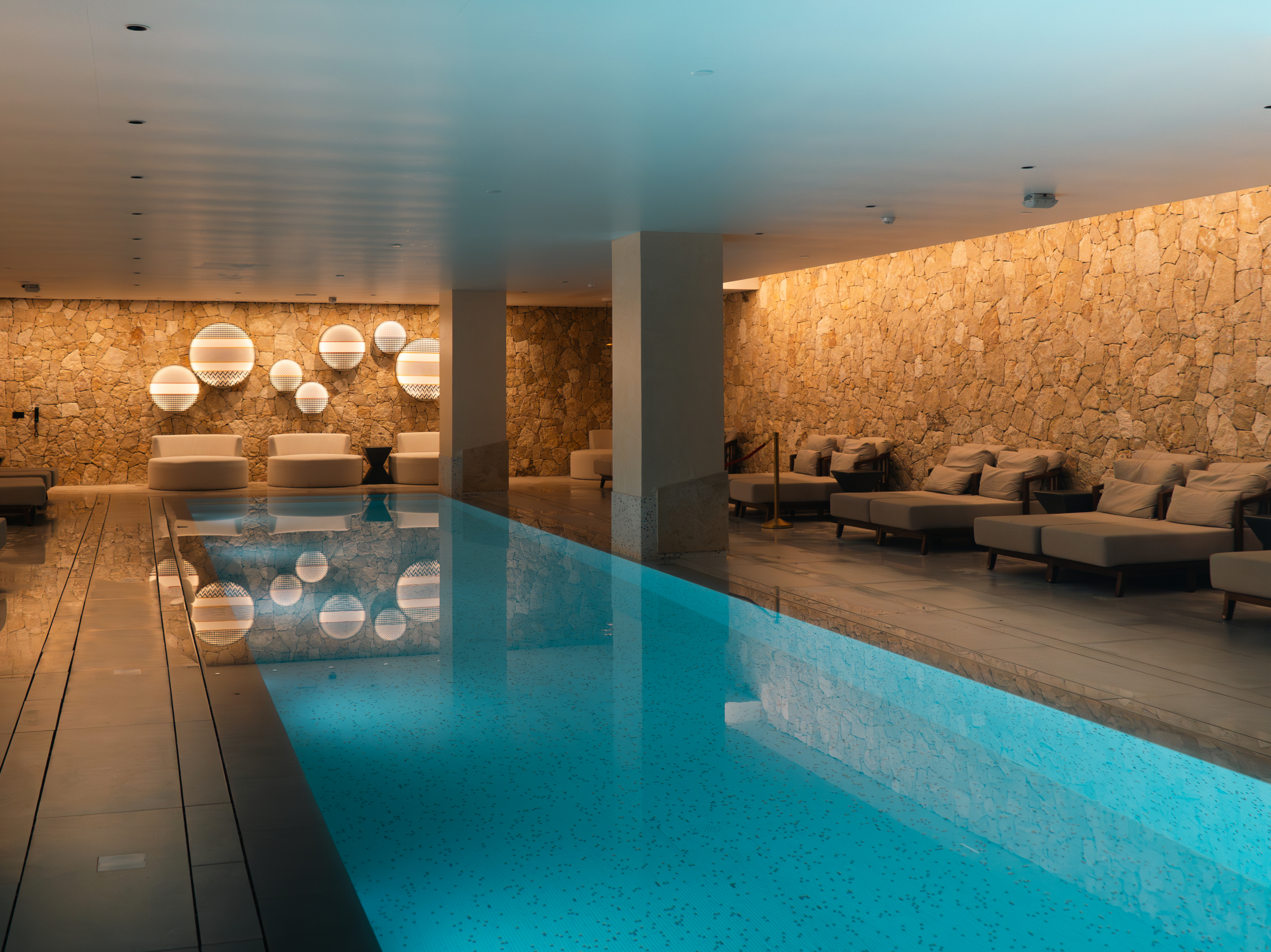 Beyond its vibrant façade, Hyatt Centric Malta also embraces the softer, more tranquil side of the island’s character. Inspired by Malta’s natural landscape, the indoor pool area offers a serene wellness retreat, providing guests with a peaceful escape. Characterised by exposed limestone walls and bathed in warm, ambient lighting, the pool area evokes a Mediterranean sanctuary—even if only for a short while. At its centre, a stunning light composition reflects elegantly over the pool’s surface, enhancing the immersive experience.