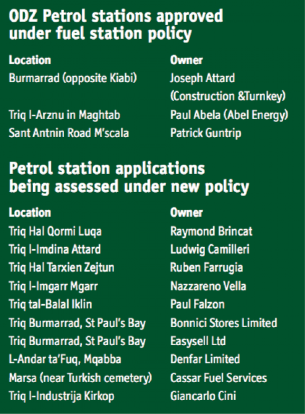 The new policy as proposed by ERA effectively bans new petrol stations in the ODZ. Therefore if the rules come into force now, all pending ODZ applications including the one in Luqa discussed last Thursday will not be approved.