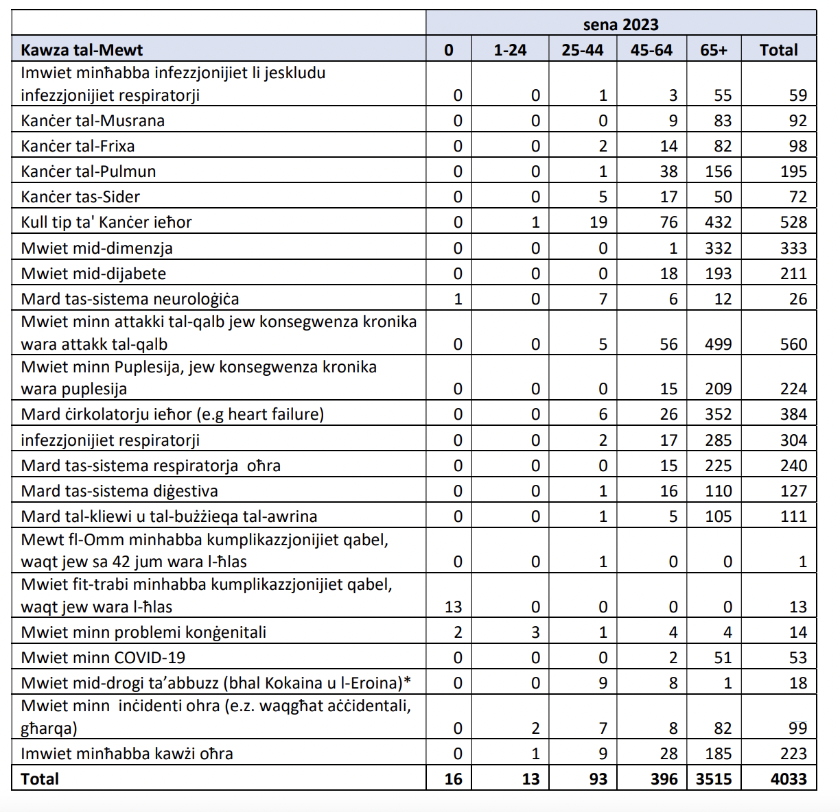 Information tabled in parliament by health minister Jo Etienne Abela in response to PN MP Mark Anthony Sammut breaks down the causes of death of the 4,033 people who died in 2023.