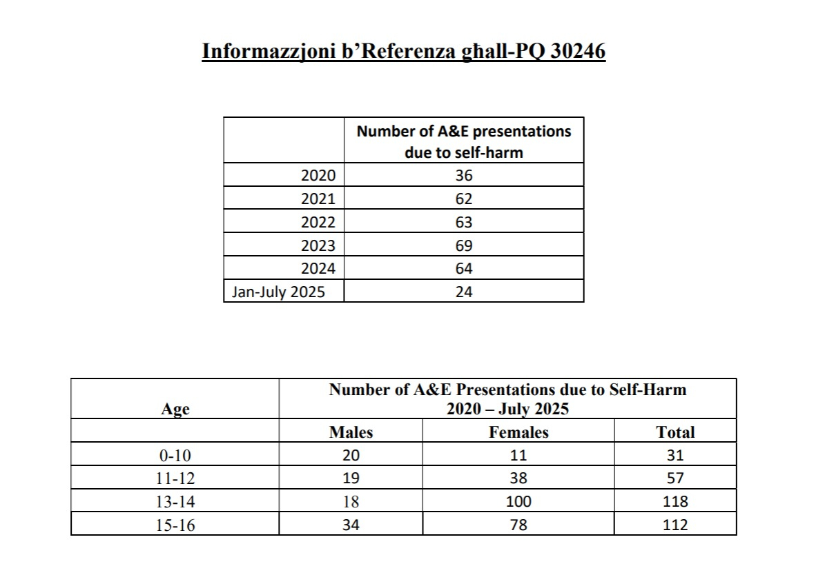 According to data tabled in parliament by Health Minister Jo Etienne Abela, 318 children presented at accident and emergency services for self-harm between 2020 and July 2025.