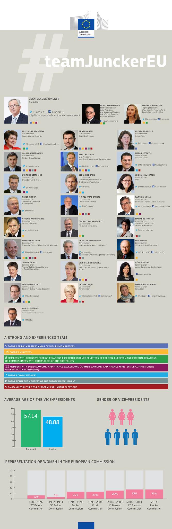 Juncker’s “strong and experienced team” is made up of five former prime ministers and four deputy prime ministers; 19 former ministers; eight members with extensive foreign relations experience; 11 members with solid economic and finance background; seven former commissioners; eight former or current MEPs and nine who campaigned in the 2014 European Parliament elections.