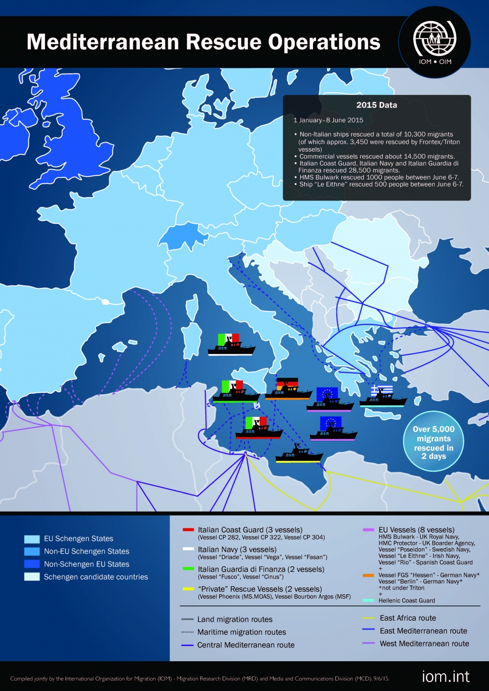 According to IOM estimates, thus far this year has seen the Italian Coast Guard, Italian Navy and Italian Guardia di Finanza rescue over 28,500 migrants. Meanwhile other European Union and commercial vessels have rescued just over 10,000 migrants, nearly 3,500 of whom were rescued under the EU’s Frontex/Triton maritime patrol operation. An additional 14,500 people were rescued by commercial vessels, adding up to a total of 53,000 rescued migrants brought to Italy so far this year.